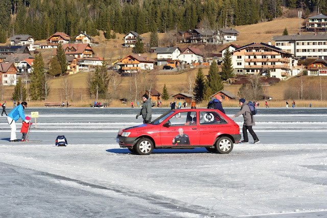 Na Weissensee ni snega, tudi umetnega ne, samo otroško sedežnico in tekaško progo so zasnežili. So pa bile temperature dovolj nizke, da je zaledenel zahodni del jezera, ki je bolj plitev. In tam se je dogajalo! Eni so na ledeni plošči drsali, drugi se sprehajali ali pustili vleči s konji, psi, sankami. Vzdušje pa je bilo tako prijetno (kakorkoli se to kičasto sliši, ampak drugega izraza ni), da smo pozabili na pomanjkanje snega in uživali na polno.